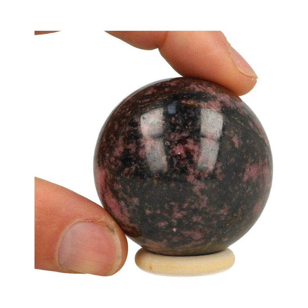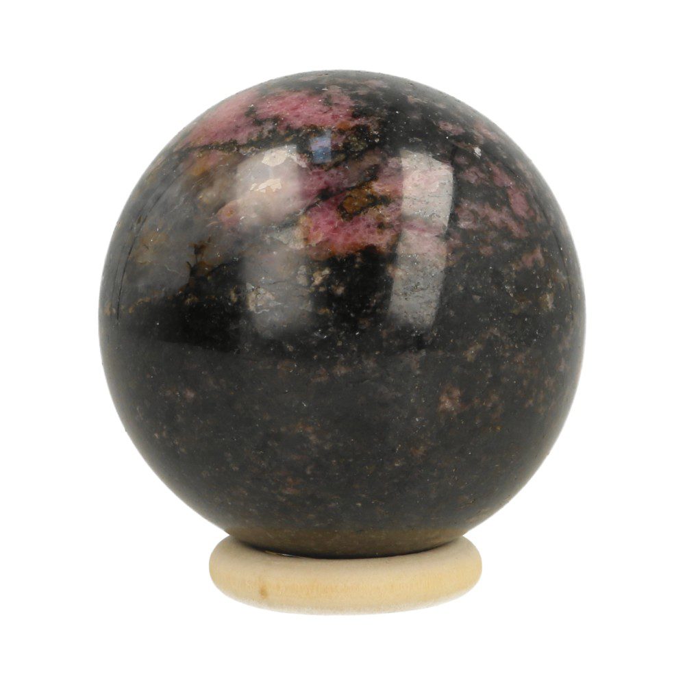 Mooie zwart-roze rhodoniet bol met een diameter van 52mm uit Madagaskar. Je ontvangt deze rhodoniet bol met een ringetje.