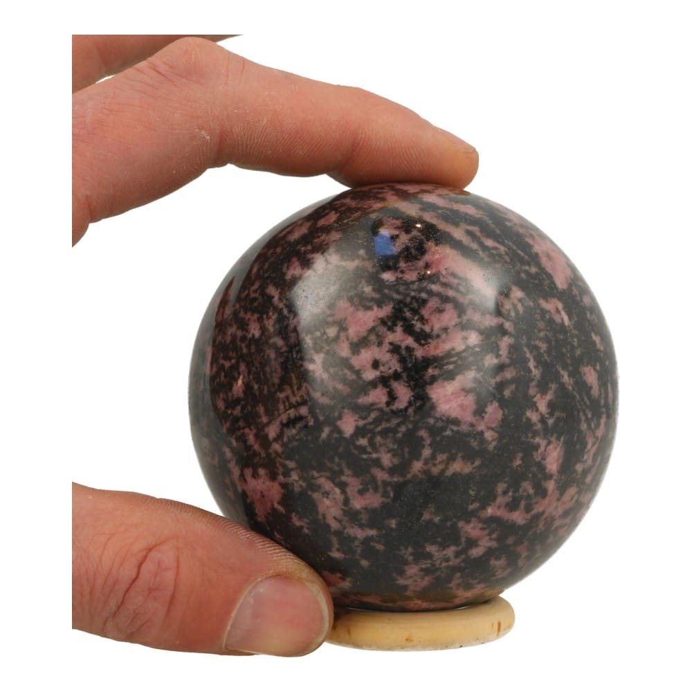 Mooie zwart-roze rhodoniet bol met een diameter van 78mm uit Madagaskar. Je ontvangt deze rhodoniet bol met een ringetje.