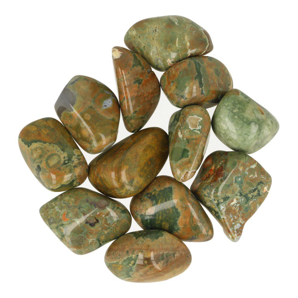 Prachtige rhyoliet trommelsteen van circa 2,5-3,5cm lang met stuk voor stuk verschillende kleuren. Iedere rhyoliet trommelsteen is uniek in kleuren en tekening, maar gelijksoortig aan de trommelstenen op de foto. Rhyoliet wordt ook wel regenwoudjaspis genoemd.