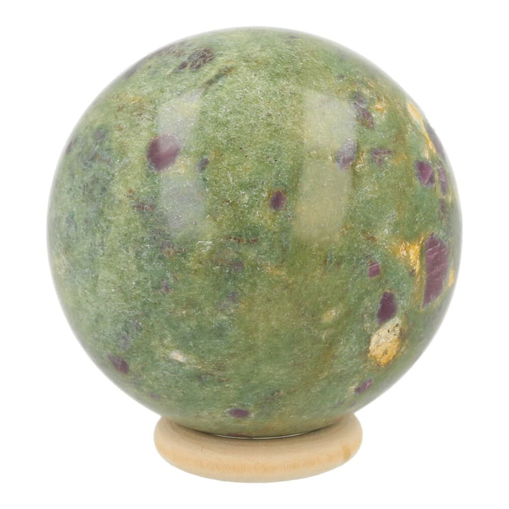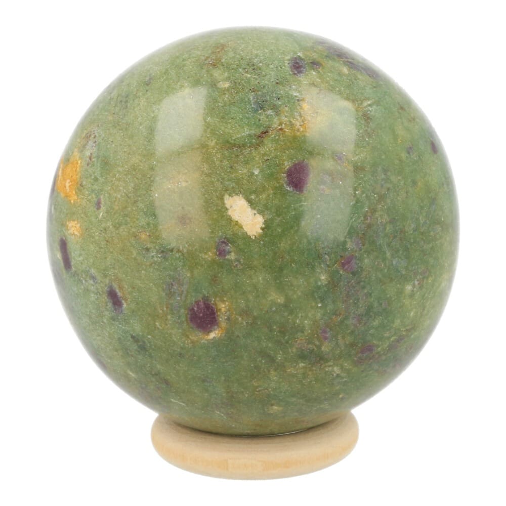Mooie robijn in fuchsiet bol met een diameter van 57mm. Deze fijne bol heeft een combinatie van helder groene fuchsiet met diep rode robijn. Een frisse en bijzondere bol die je jarenlang kan ondersteunen. Je ontvangt de robijn in fuchsiet bol van de foto, inclusief een houten ring.
