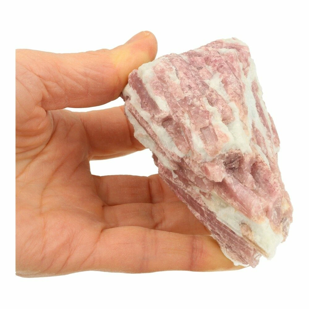 Mooi getekende rubelliet ruw ‘nr1’ met veel toermalijn kristallen. De afmeting van deze ruwe rubelliet is ongeveer 11cm lang, 6cm breed en 5cm hoog. Topkwaliteit rubelliet met helderpaarse toermalijn kristallen in witte kwarts met albiet. Je ontvangt de rubelliet ruw van de foto.