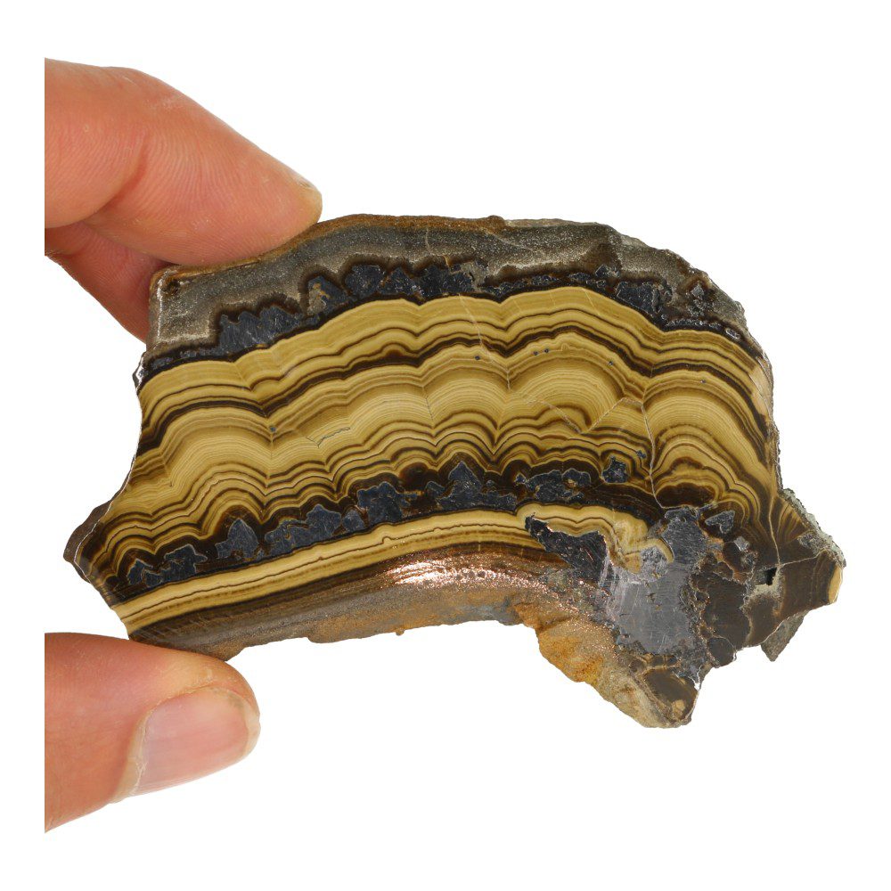 Fraai plat stukje gepolijste schalenblende met prachtige tekening. De afmeting van dit stuk schalenblende is ongeveer 9cm breed, 5,5 cm hoog en 0,7cm dik. Alleen de voorzijde van de plak is gepolijst, de achterzijde is mat. Zoals op de foto te zien is heeft het stuk een fraaie glans. Je ontvangt de gepolijste schalenblende van de foto.