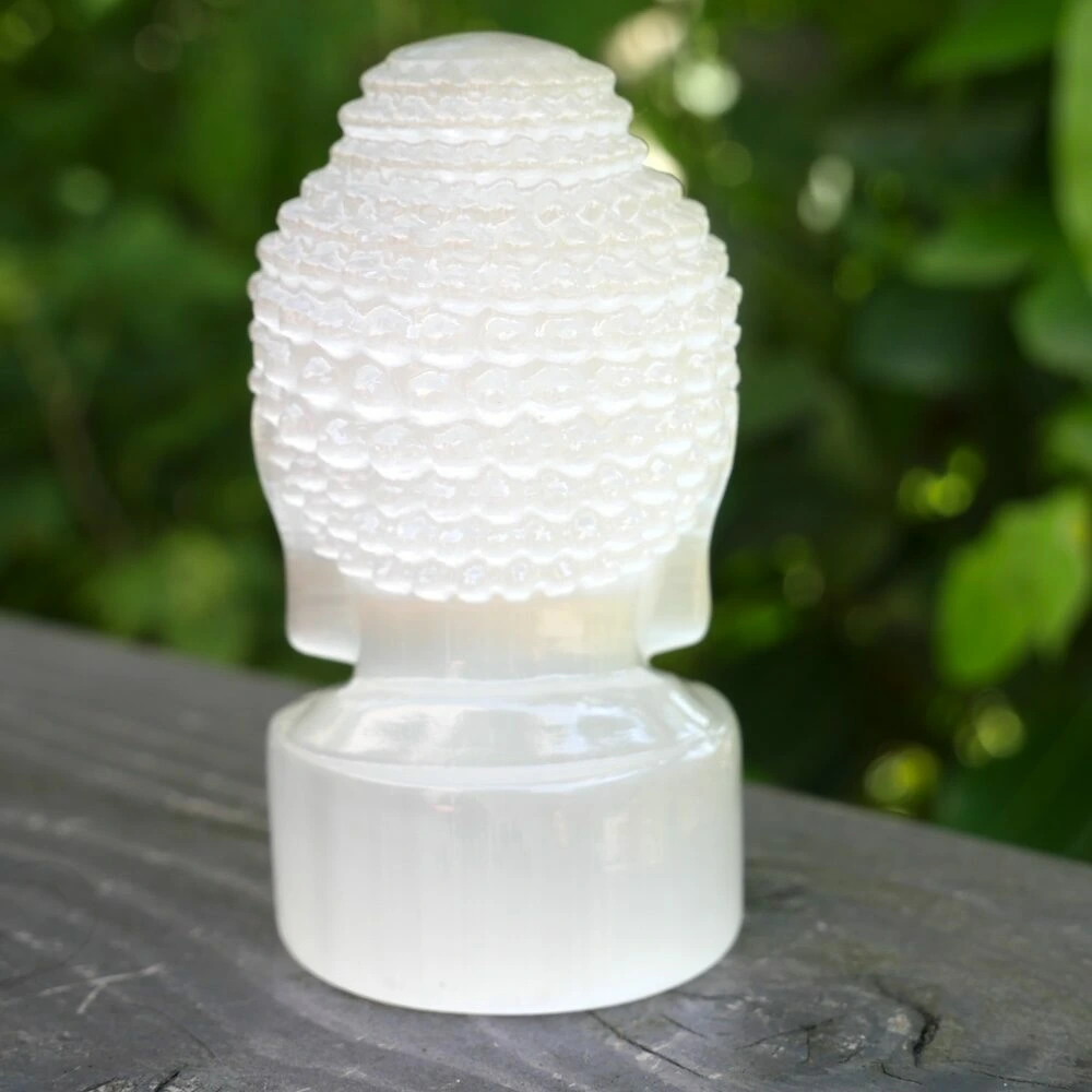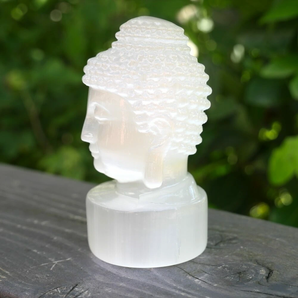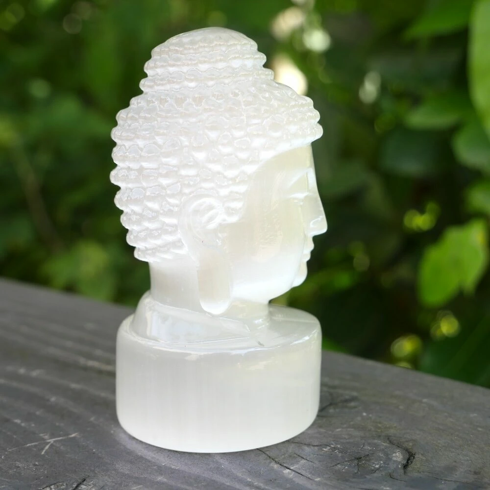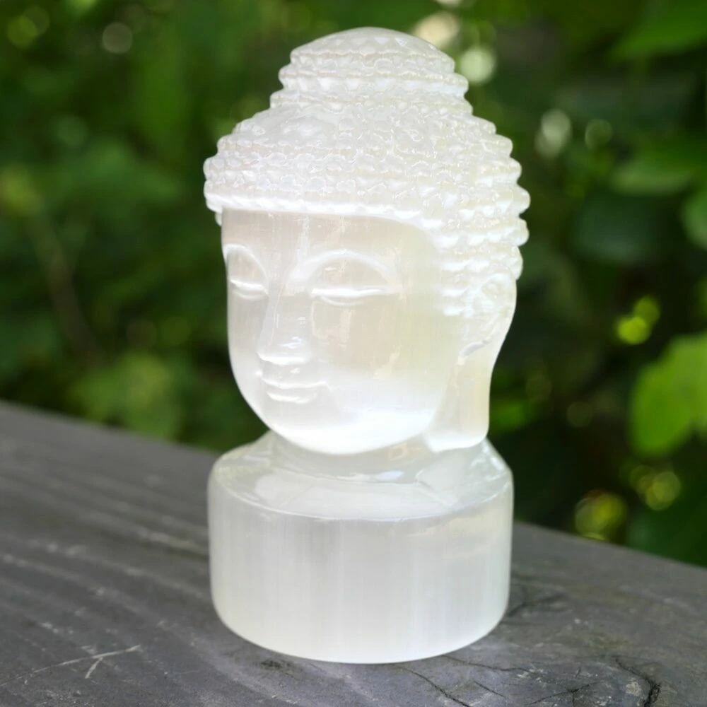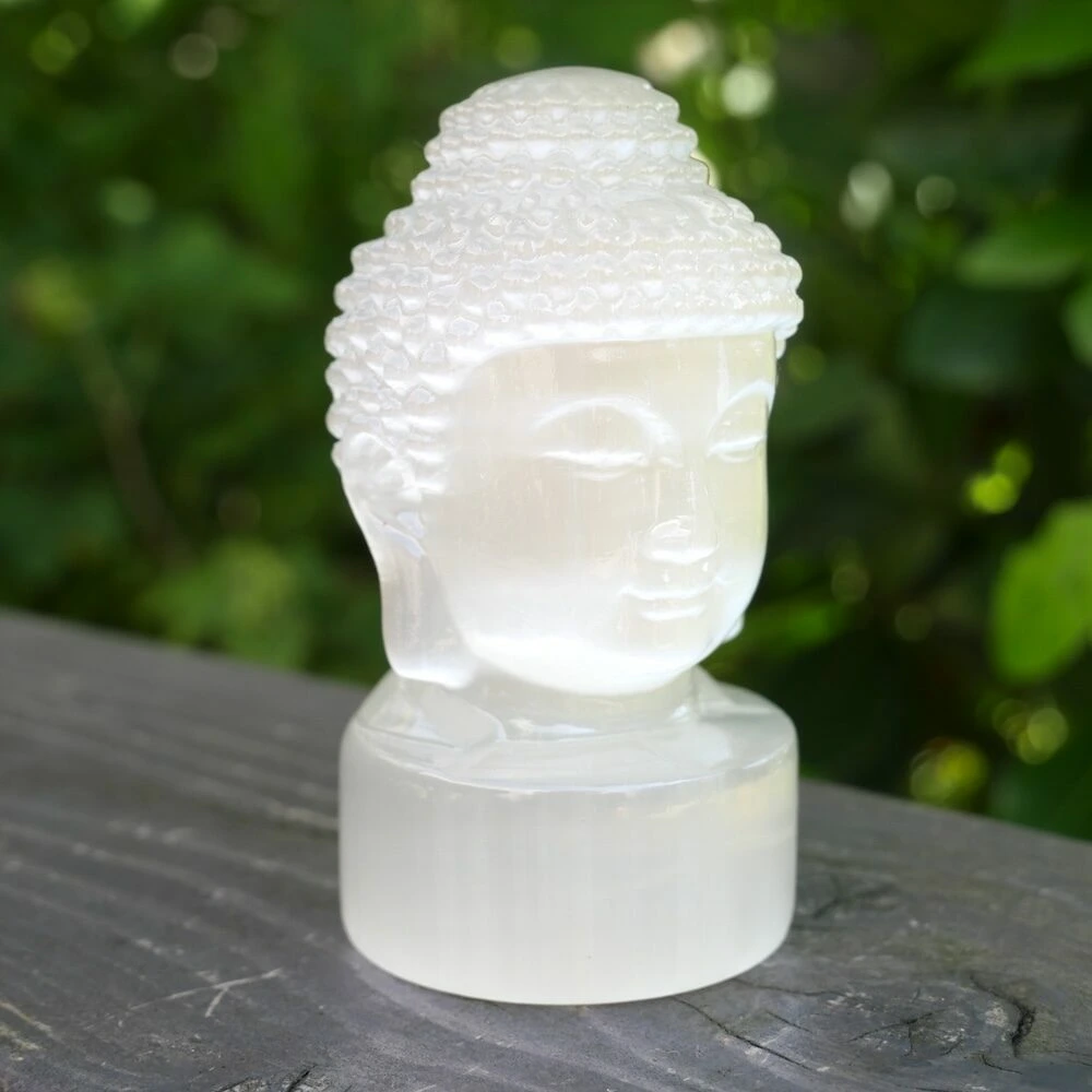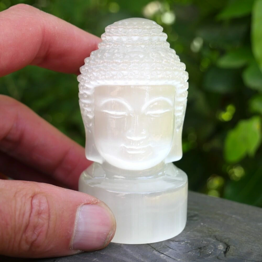Fraaie A-kwaliteit seleniet boeddha hoofd (satijnspaat) van circa 8cm hoog en 4,5cm breed met verfijnde afwerking. Je ontvangt een soortgelijk seleniet boeddha hoofd als op de foto, ze zijn zeer gelijkwaardig in kwaliteit. Dit seleniet boeddha hoofd is met epoxy afgewerkt om de zachte seleniet te beschermen en de glans te versterken, een fraai boeddha hoofd met serene en heldere energie, prachtig!