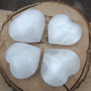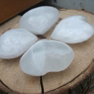 Fraai seleniet hart (satijnspaat) van ongeveer 5,5 – 7cm breed en hoog en 2,5 cm dik. Je ontvangt een soortgelijk seleniet hart als op de foto.