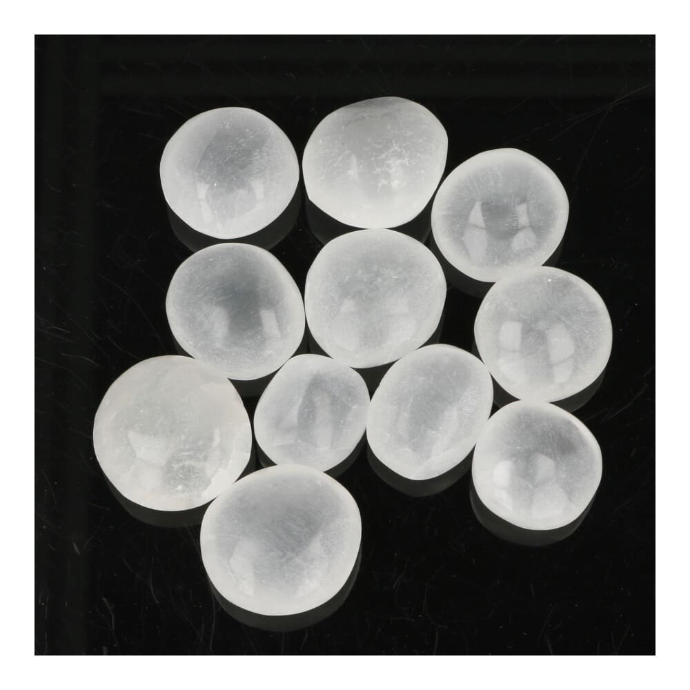 Fijne seleniet trommelsteen (satijnspaat). De afmeting van deze seleniet trommelsteen wisselt en is ongeveer 2 – 3 cm lang. Afhankelijk van het invallende licht kan de kleur meer wit of juist doorzichtig ogen. Seleniet kan beter niet te veel met water in contact komen.