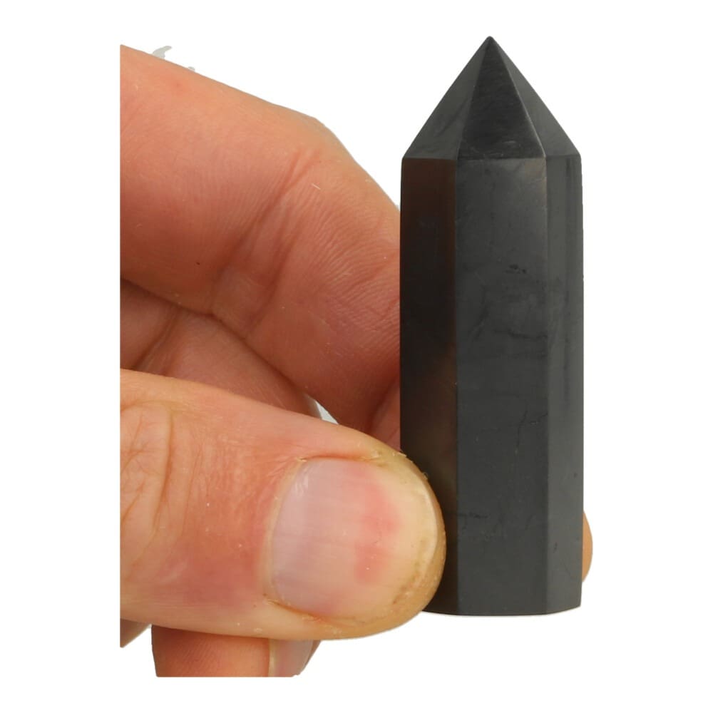 Glanzend zwarte shungiet punt van 6cm hoog en een basis van circa 1,5 x 2cm. Je ontvangt een soortgelijke shungiet punt als op de foto, we zoeken de beste voor je uit bij je bestelling.