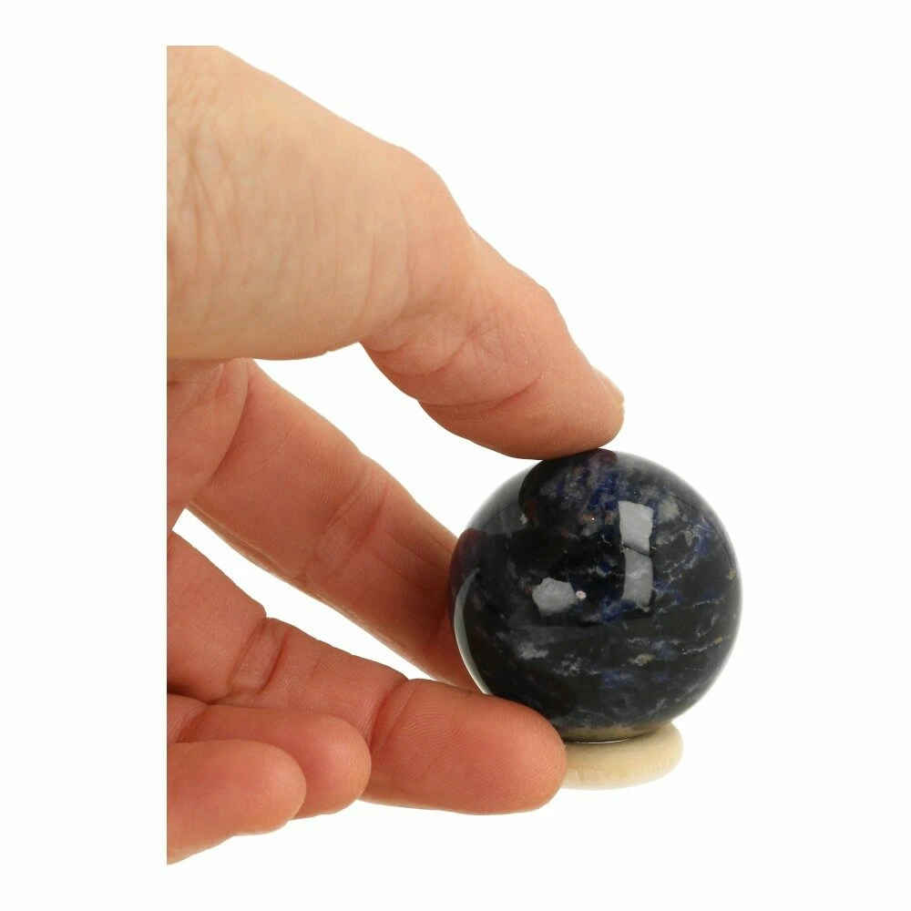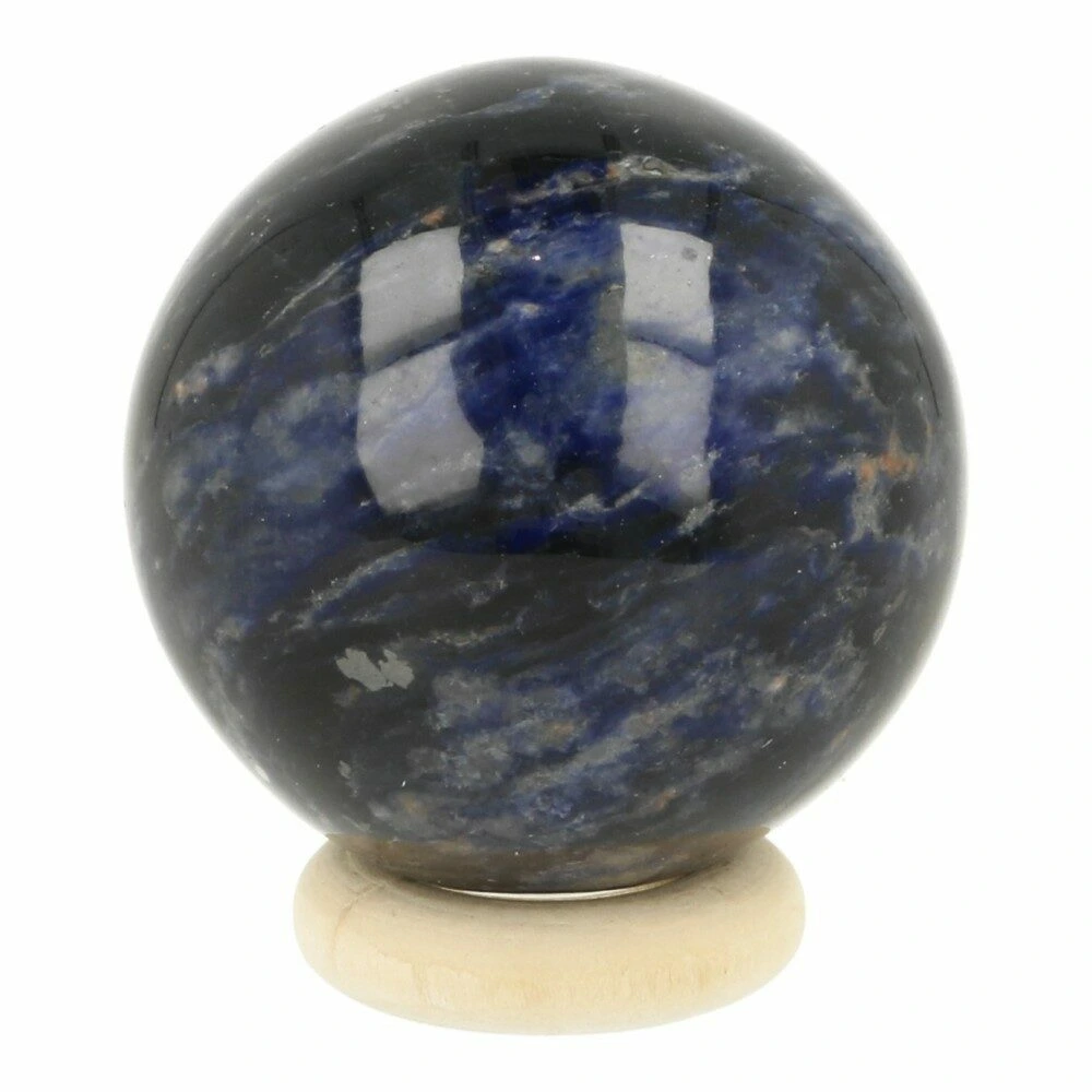 Mooi formaat sodaliet bol met de karakteristieke diep-blauwe kleur en witte calciet aders. De diameter van deze sodaliet bol is circa 4cm. Je ontvangt een soortgelijke sodaliet bol als op de foto, inclusief houten ring.