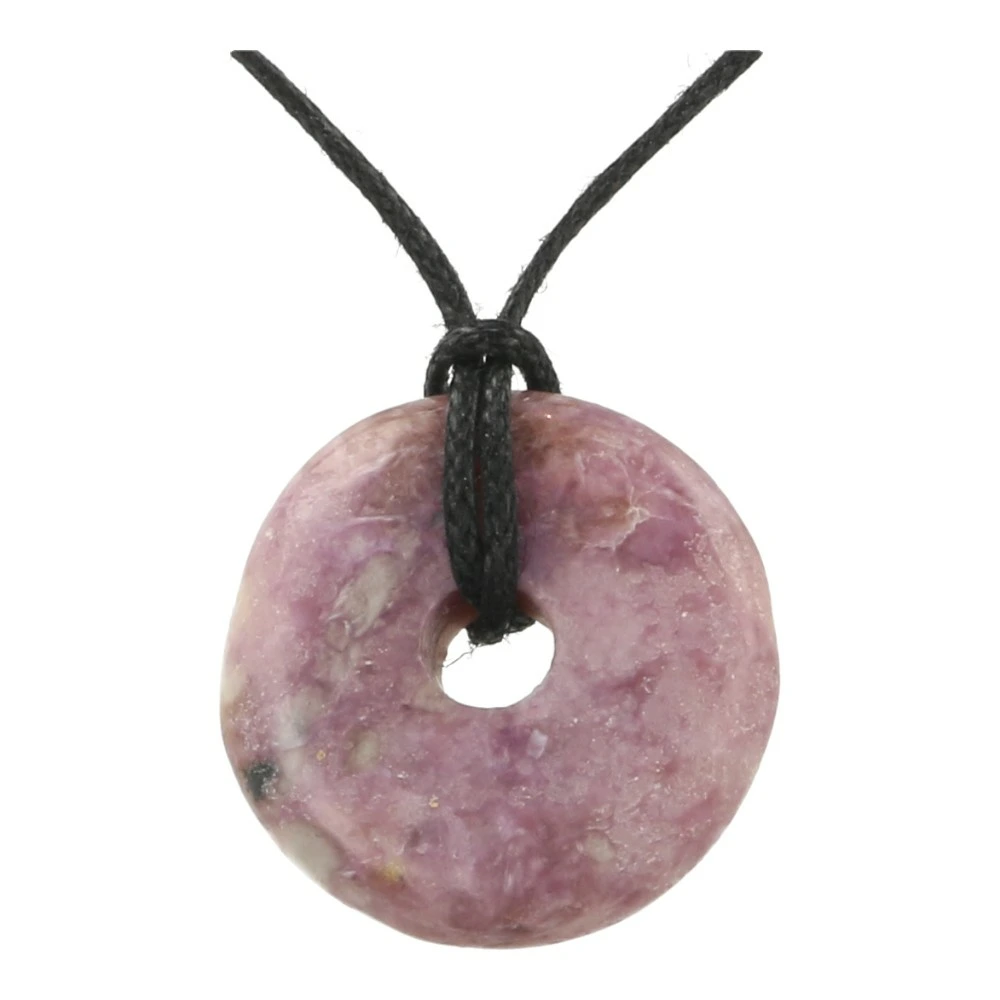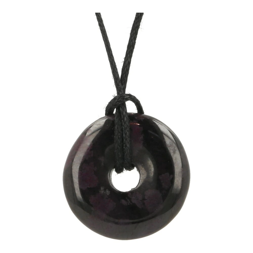 Fraaie paars-zwarte sugiliet donut hanger nr1 van 2,5cm diameter aan zwart koord. Deze subiet donut hanger komt uit Zuid-Afrika. Je ontvangt de sugiliet donut hanger van de foto aan een zwart waxkoord.