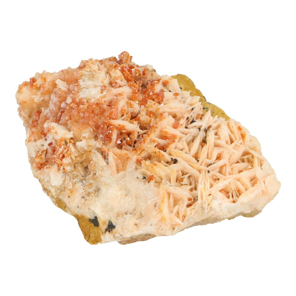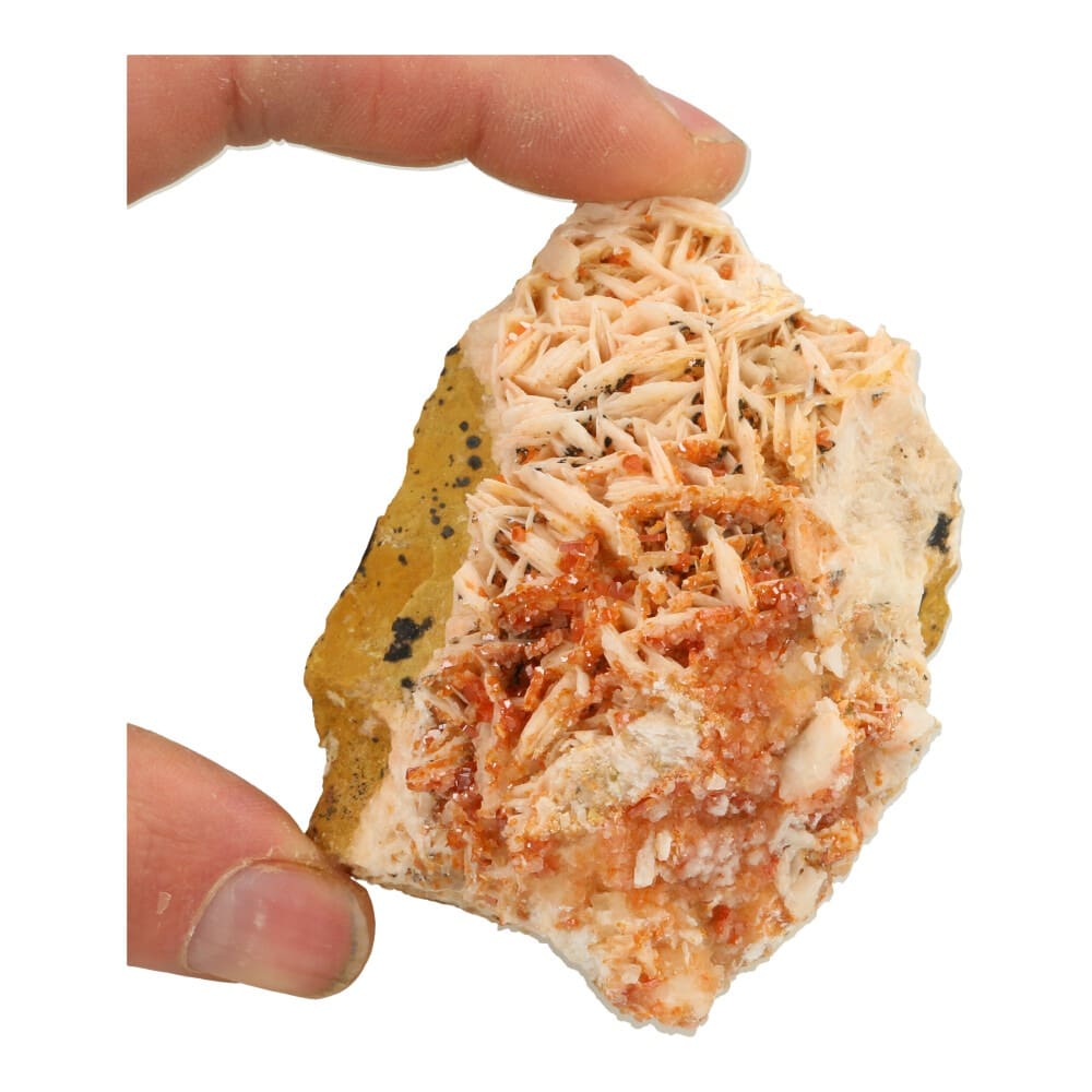 Mooi stuk met fraaie vanadiniet kristallen op roze bariet uit Marokko. De afmeting van dit stuk vanadiniet ruw is ongeveer 7,5 x 6 x 4,5cm. Aantrekkelijk aan dit stuk zijn de fraaie roze bariet kristallen, met fijne oranje-rode vanadiniet er overheen. Naast dit fijne stuk hebben we meerdere stukken vanadiniet op bariet op voorraad, neem hiervoor contact met ons op via de app of email. Je ontvangt het stuk van de foto.