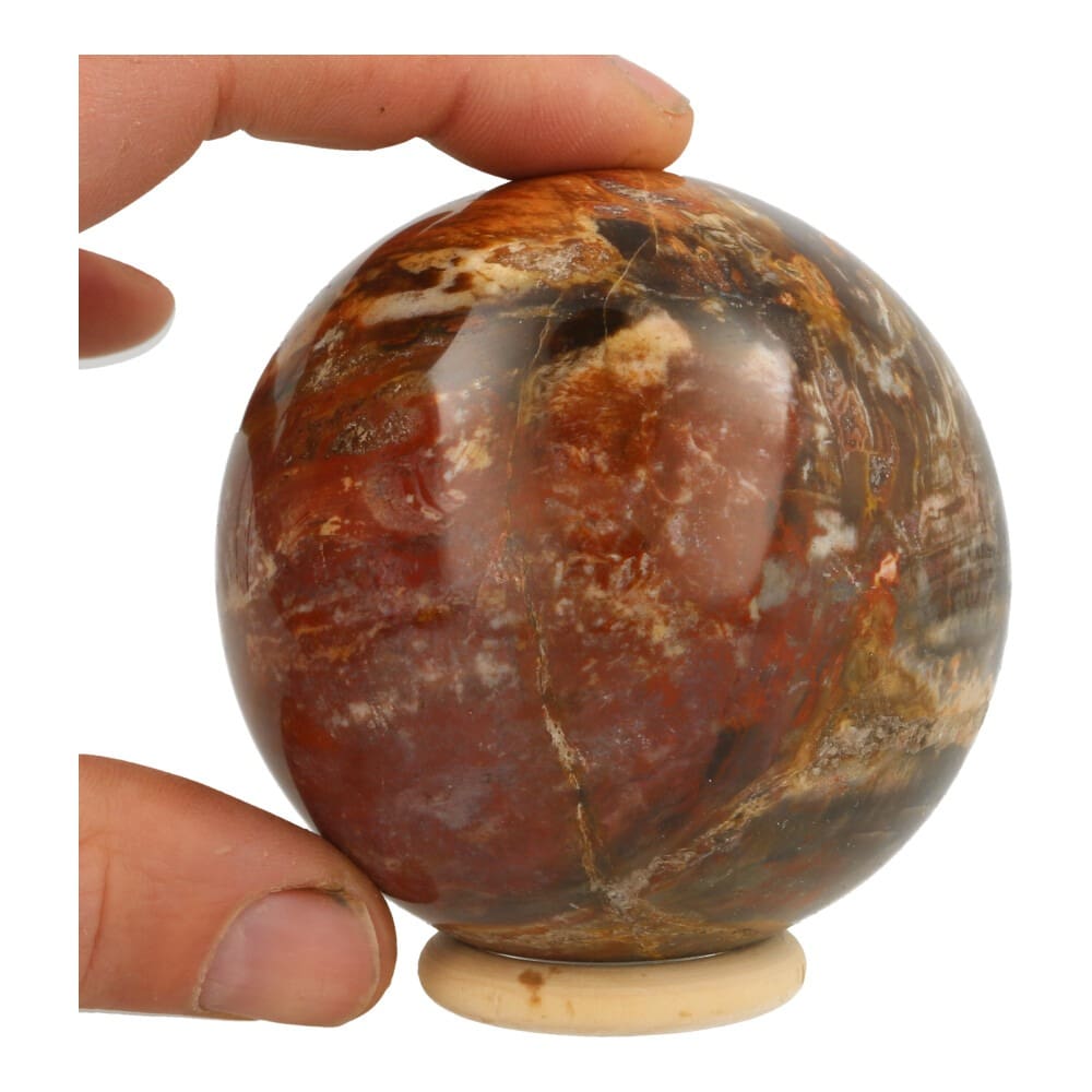 Mooie versteend hout bol met een diameter van ca 79mm uit Madagaskar. Echt een uniek stuk met hele mooie kleuren. Versteend hout is fossiel geworden boomstam van miljoenen jaren oud. Ieder stuk is uniek, deze bol heeft prachtige variaties in kleuren en is vanaf iedere zijde anders. Je ontvangt de bol van de foto met houten ring.