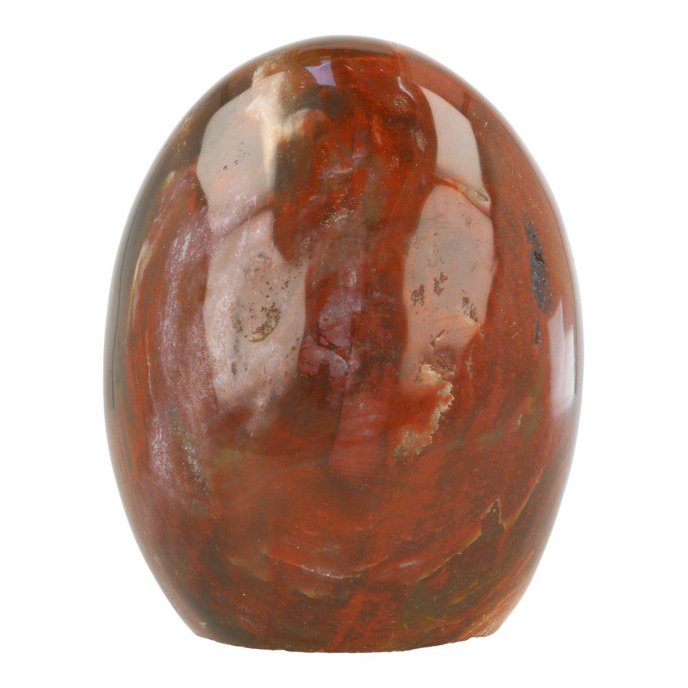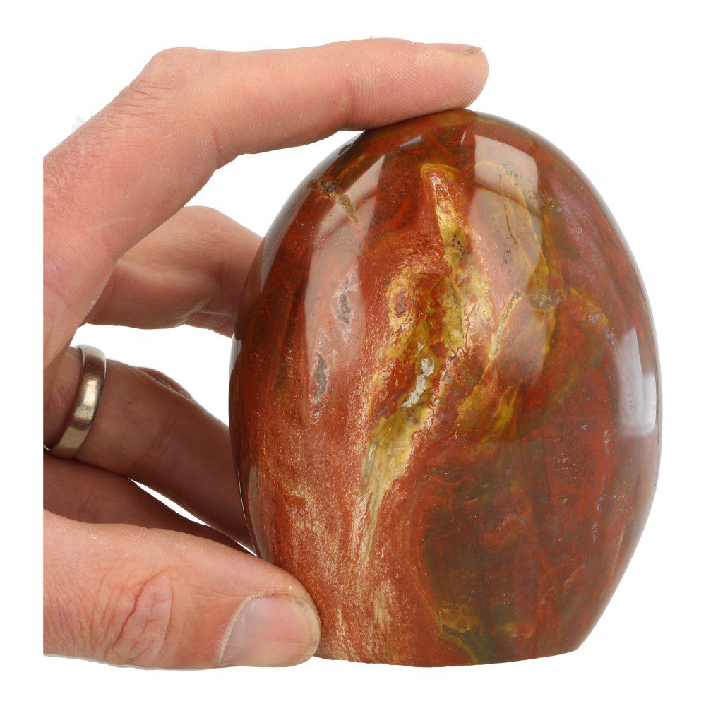 Mooie versteend hout vrije vorm met een hoogte van ca 10,3 cm, een breedte van 8,3 cm en een dikte van 5,6 cm. Echt een fijn stuk met hele mooie kleuren. Versteend hout is fossiel geworden boomstam van miljoenen jaren oud. Ieder stuk is uniek, dit stuk  heeft prachtige variaties in kleuren en is vanaf iedere zijde anders. Je ontvangt de versteend hout gepolijste vorm van de foto.