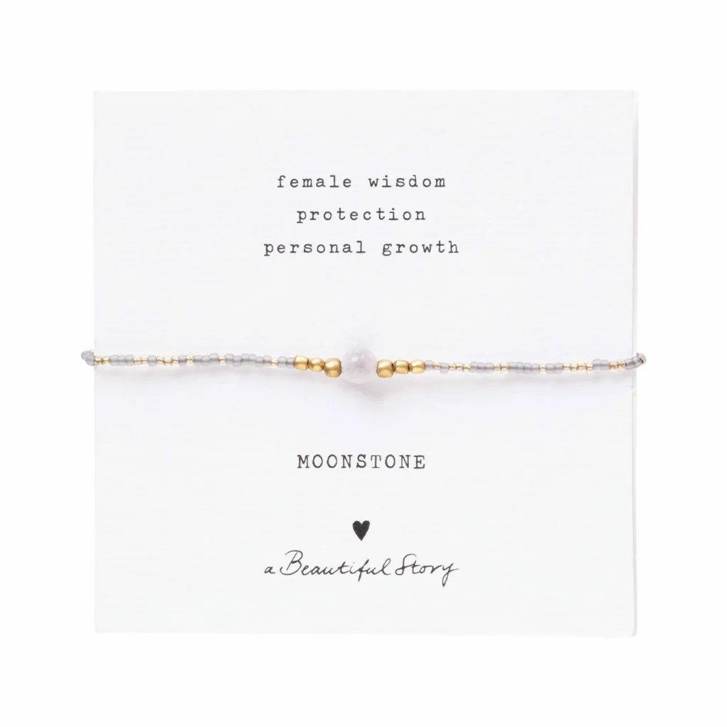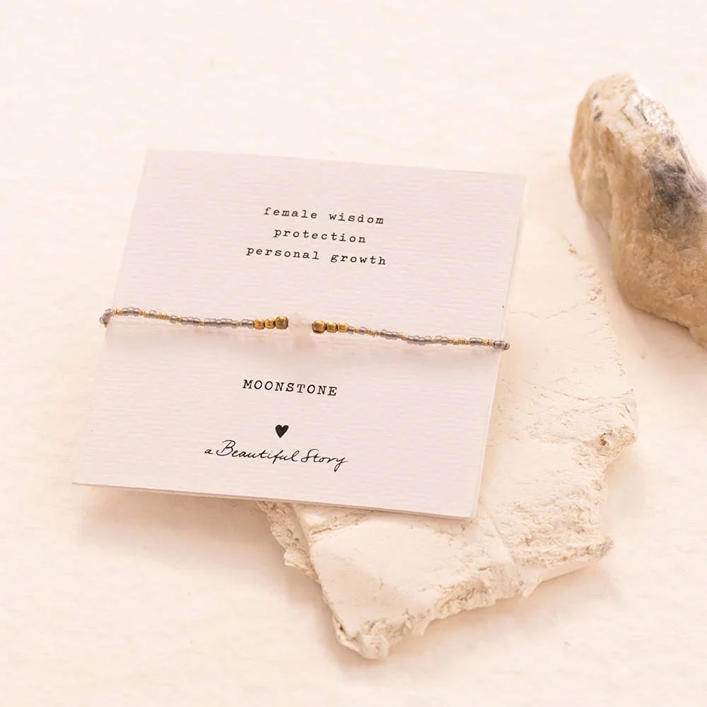 Maak kennis met de Iris Card Maansteen Goudkleurige Armband van A Beautiful Story. De handgemaakte armband is gemaakt van katoenen draad met glaskralen, messing kralen en een kleine maansteen edelsteen en heeft een verstelbare schuifknoop. De lengte van de armband is 16 – 22 centimeter. De armband is bevestigd op een papieren kaart.