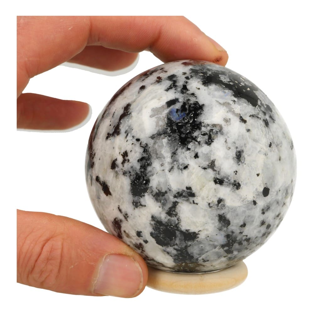 Fraaie witte, of regenboog maansteen bol met een diameter van ongeveer 74mm uit India. De witte maansteen bol heeft op een groot aantal plekjes een mooie glimmend blauwe schittering. Je ontvangt de regenboog maansteen bol van de foto, inclusief houten ringetje. De ‘nr2’ is slechts een aanduiding om de bollen met zelfde diameter van elkaar te onderscheiden.