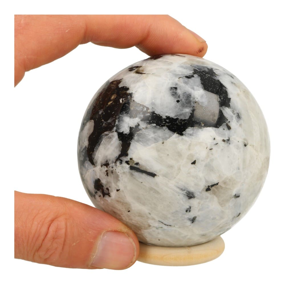 Fraaie witte, of regenboog maansteen bol met een diameter van ongeveer 75mm uit India. De witte maansteen bol heeft op een aantal plekjes een mooie glimmend blauwe schittering. Je ontvangt de regenboog maansteen bol van de foto, inclusief houten ringetje. De ‘nr2’ is slechts een aanduiding om de bollen met zelfde diameter van elkaar te onderscheiden.