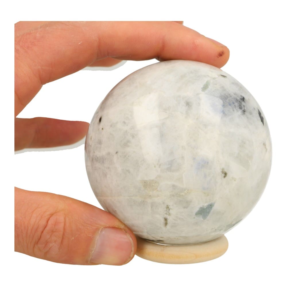 Fraaie witte, of regenboog maansteen bol met een diameter van ongeveer 75mm uit India. De witte maansteen bol heeft op een aantal plekjes een mooie glimmend blauwe schittering. Je ontvangt de regenboog maansteen bol van de foto, inclusief houten ringetje. De ‘nr3’ is slechts een aanduiding om de bollen met zelfde diameter van elkaar te onderscheiden.