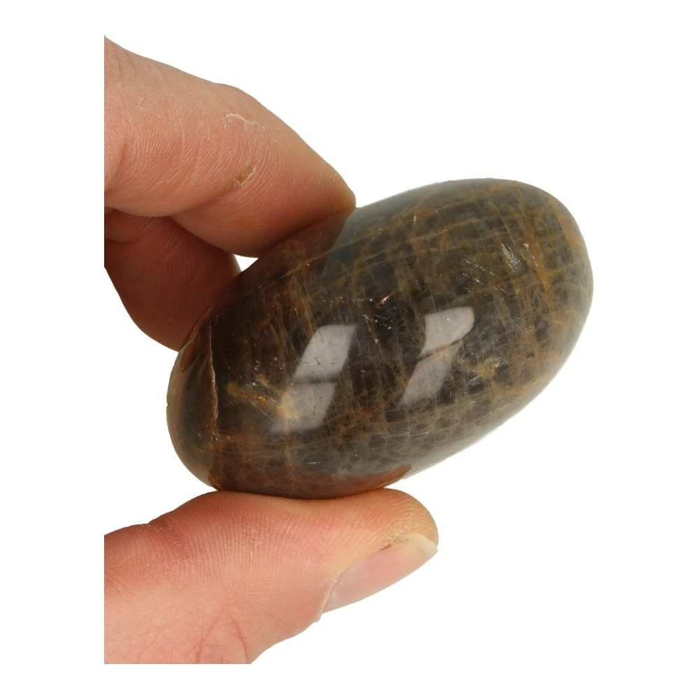 Mooie zwarte maansteen knuffelsteen groot met afmetingen van circa 6,5 – 7,5cm lang, 5 – 6cm breed en 3 – 4 cm dik. De kleurstelling varieert van heel donker naar grijs en bruintinten. Iedere zwarte maansteen knuffelsteen is anders, je ontvangt een soortgelijk exemplaar als op de foto.
