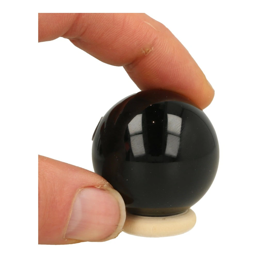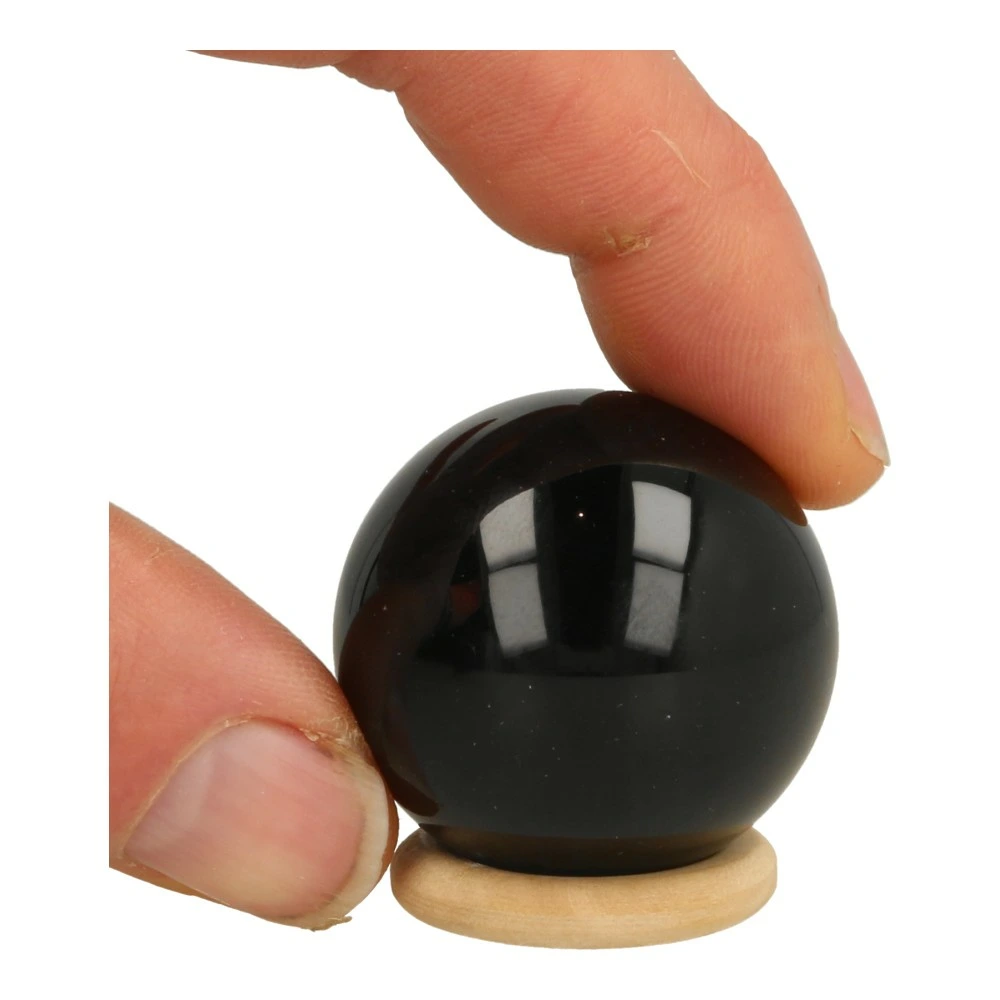 Mooie diep zwarte obsidiaan bol met een diameter van circa 37-40mm. We hebben meerdere zwarte obsidiaan bollen op voorraad. Je ontvangt een soortgelijk exemplaar als op de foto met houten ringetje. In uiterlijk zijn ze zeer gelijkend op de foto.