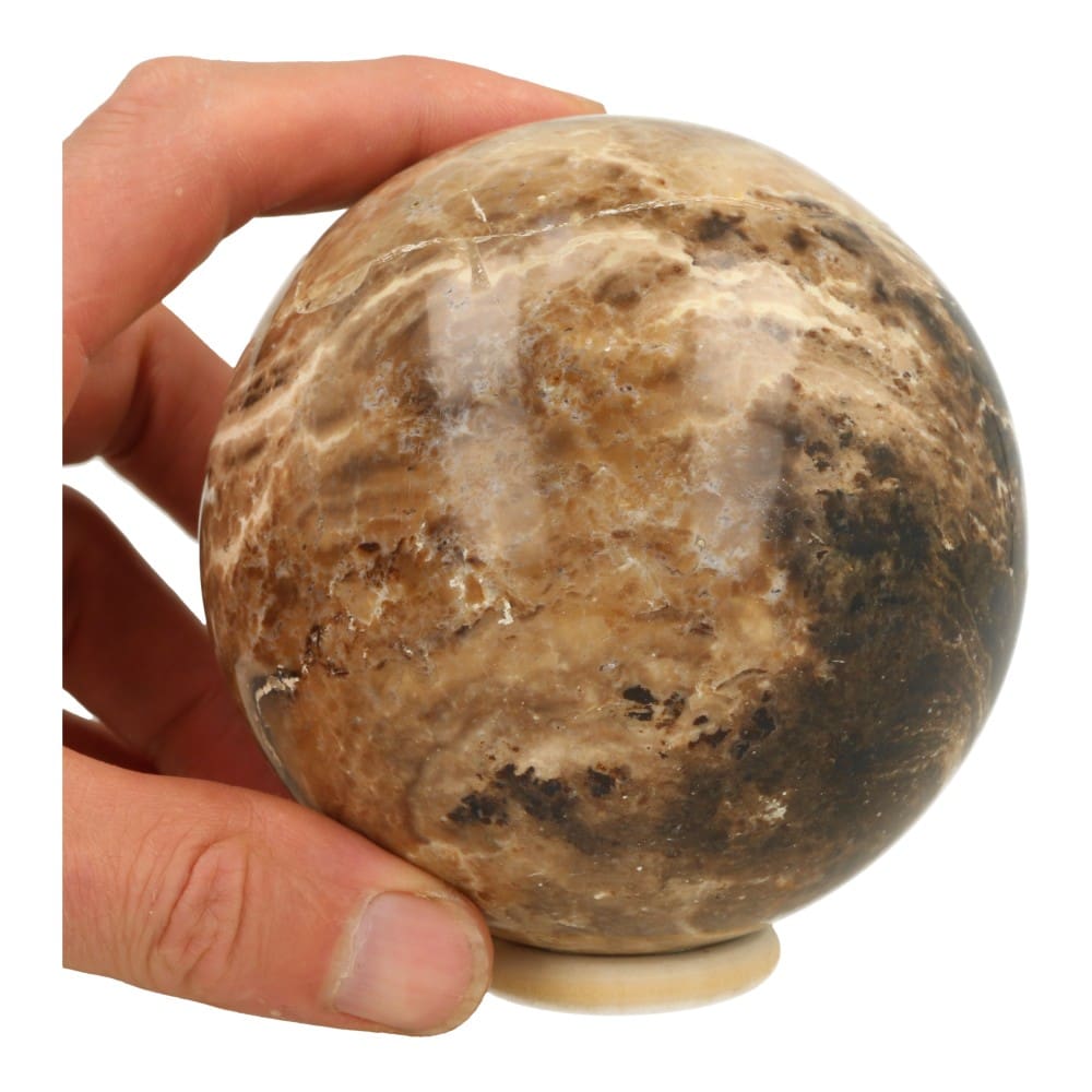 Fijne zwarte opaal bol met een diameter van 10cm en houten ring uit Madagaskar. Deze zwarte opaal bol is een zachte opener, die je op aarde houdt. Je ontvangt de zwarte opaal bol van de foto.