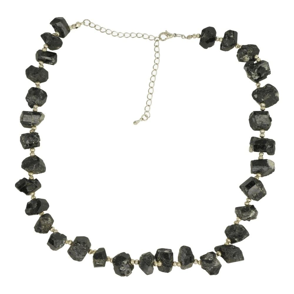 Robuuste zwarte toermalijn ketting met ruwe stukje zwarte toermalijn van circa 1-2cm groot. De lengte van de zwarte toermalijn ketting ruw kan worden aangepast van 40-50cm door middel van het kettinkje o het uiteinde. Je ontvangt een soortgelijke zwarte toermalijn ketting ruw als op de foto.