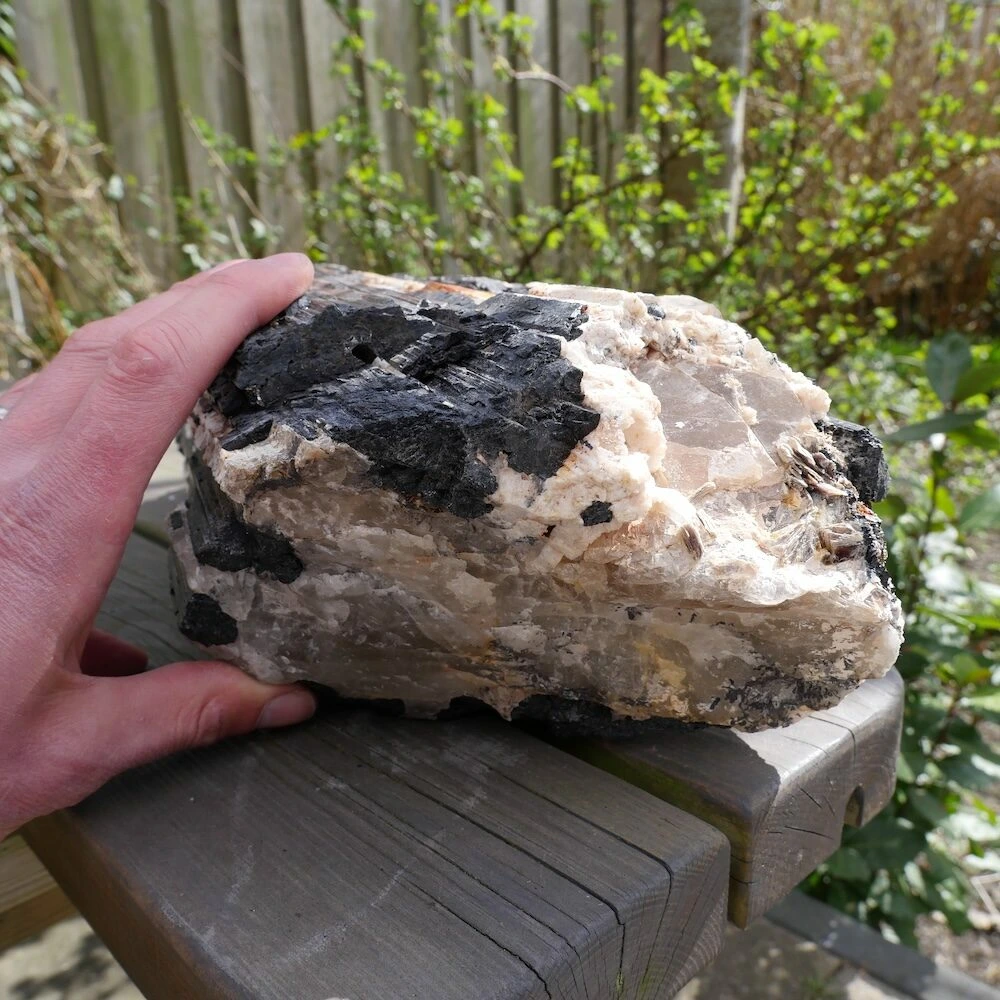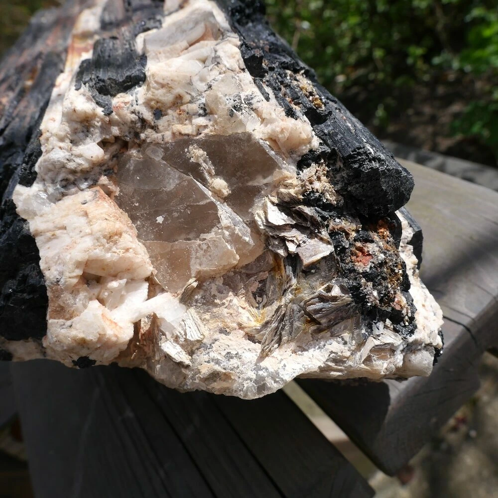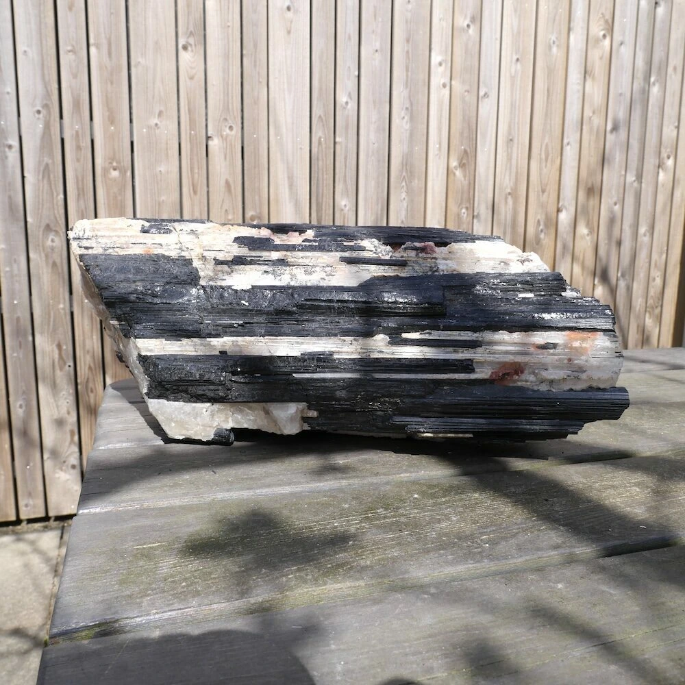 Mooi groot stuk zwarte toermalijn ruw XL nr2, van ruim 14,5kg en maar liefst 40 x15 x 12cm uit Brazilië. Een groot diepzwart brok met stukjes (rook)kwarts en mica. Een flink groot stuk om te stralen in jouw ruimte. Je ontvangt uiteraard de zwarte toermalijn ruw XL van de foto.